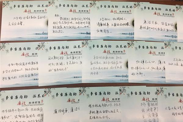 清正行得千里路,廉明驶得万里船。心中明镜,自律人生;廉洁佳偶,和谐家庭......一 张小小的卡片,字字情真意切,句句发自肺腑, 寄托了亲人的关怀与鞭策,充满浓浓的关爱、朴实的情感。