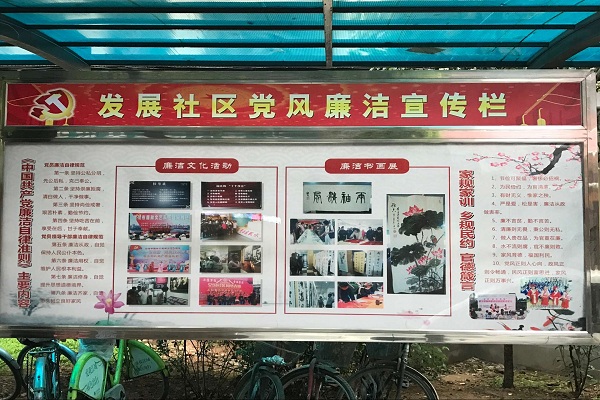 今年以来,该区按照“十进十建”活动部署,着力建强社区廉洁文化阵地,在惠民资金、文化活动等经费使用上向社区廉洁文化阵地建设倾斜,在各社区建立起廉洁文化长廊、楼道、电子宣传栏、电影放映室等系列廉洁文化阵地。区纪委和街道纪工委组织干部经常性深入社区,指导各社区结合重要时间节点和不同时期关注热点,及时发布和更换宣传阵地内容。