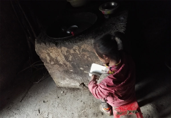 进屋环视一周,屋内幽暗潮湿,但我的视线马上被一个穿浅红色上衣的小女孩吸引住了。我愣住了,更沉默了,5岁的巫阿牛在正静静地坐在灶台边,借着屋门透进来的微光看书。