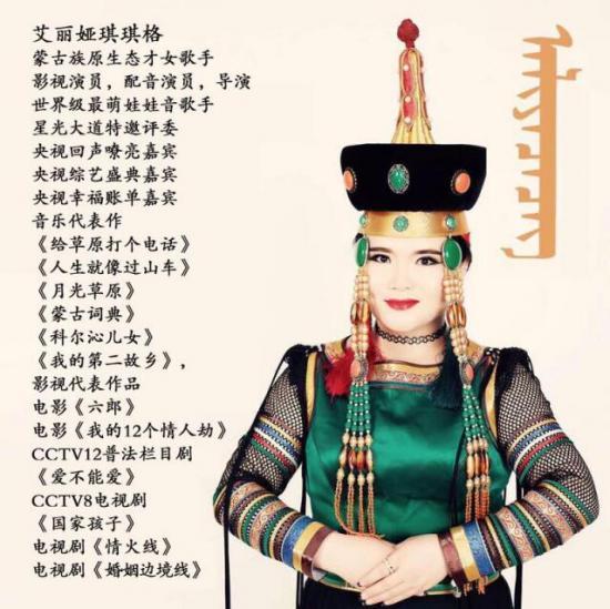 艾丽娅琪琪格,著名蒙古族原生态才女歌手,影视演员,配音演员,导演,世界级最萌娃娃音歌手,多次受邀参加,星光大道特邀评委,央视回声嘹亮嘉宾,央视综艺盛典嘉宾,央视幸福账单嘉宾。