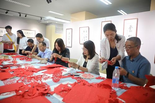 图为参观人员现场学习创作剪纸作品。