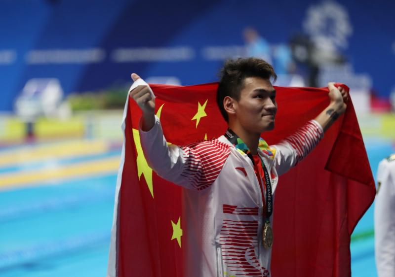 8月19日,在第18届亚运会男子100米仰泳决赛中,中国选手徐嘉余以52秒34的成绩夺冠。赛后,徐嘉余身披国旗庆祝。