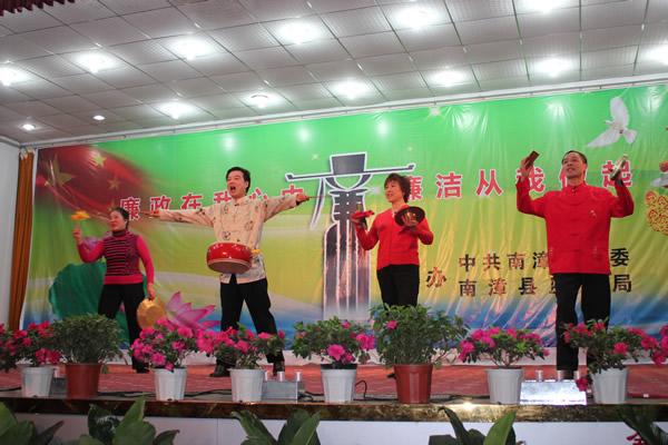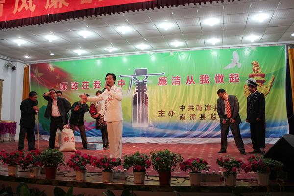 为了更好地发挥农村廉政文艺宣传队的作用,增强演出效果,各个农村廉政文艺宣传队针对不同时段、不同对象、不同层次,精心编排演出内容,深入机关、企业、街道、社区、学校、村组进行巡回演出,宣传队的身影活跃在八百里的金南漳,唱廉歌、演廉戏,将廉政文化融入寓教于乐的文艺形式之中。通过自编自演廉政文艺节目,利用群众喜闻乐见的表演形式,使基层干部群众边欣赏精彩纷呈的节目边接受廉政教育。该县还通过广场文化、节日文化、农家文化、文艺下乡等活动,增强了宣传声势和效果。既有规模较大的文艺晚会,也有街道社区、农家院落和田间地头的廉政小戏。在元旦、春节、元宵、"五一"、"十一"等节日都组织举办廉政文艺演出活动。近年来,全县各廉政文艺宣传队共演出近百场(次),观众达1万余人(次)。