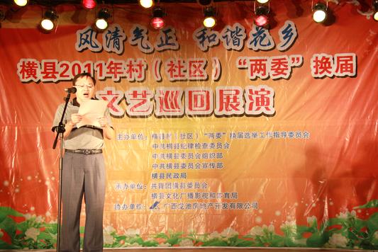 自今年8月中旬以来,横县在全县范围内举办村(社区)两委换届纪律文艺巡回展演活动,现已在百合镇、那阳镇、云表镇等6个乡镇完成展演,观展群众达到2000多人。文艺巡回展演通过生动活泼、贴近生活的表演唱、快板、相声等节目表现形式,大力宣传换届纪律,倡导文明选举,引导广大干部群众树立良好的民主法制意识和依法有序参选意识,有效提高换届纪律的知晓率,让换届纪律更加深入人心,切实保障全县2011年村(社区)“两委”换届工作平稳、有序、健康开展。(信息员:卢世亦 梁鸿飞)