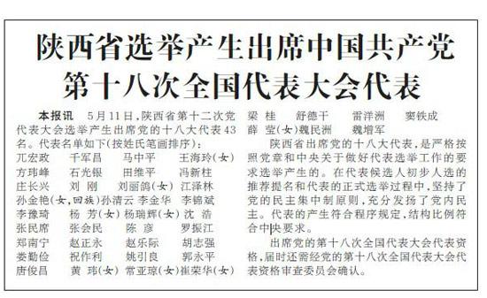 陕西省选举产生出席中国共产党第十八次全国代表大会代表