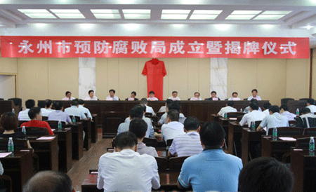 7月19日上午,湖南省永州市预防腐败局挂牌成立。省政府党组成员、省纪委副书记、省监察厅厅长、省预防腐败局局长葛洪元,市委书记张硕辅共同为市预防腐败局揭牌。省预防腐败局副局长、省纪委副秘书长胡海鹰,市领导魏旋君、唐松成、刘湘凌、董石桂、周德睿、朱映红等出席。