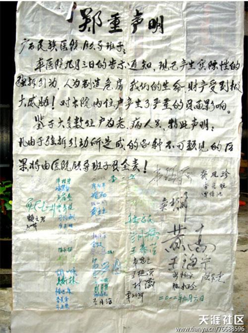 广西民族医院职工住房多于1990年以后兴建使用,最短的仅用了15年。但广西民族医院领导为了众所周知的、不可告人的经济利益目的,未经国家权威部门的鉴定,即擅自认定全部为危旧房,要整体进行“危旧房”拆迁改造。原计划将全部十几栋住房拆迁夷为平地,交由房地产开发商新建5幢高层住宅楼,作为商品房小区开发对外出售。此举遭到全院职工的强烈反对,医院领导先是对在职职工软硬兼施,恐吓下岗,再施以小恩小惠,逼迫在职职工先行外出租房。但离退休职工不买这个账,坚决抵制拆迁。院领导即将他们以前的老领导、老老师们视为阻碍他们发财的眼中钉、肉中刺,杨言要整死那帮老家伙。他们首先拿出杀手锏,大幅减少了医院以往每年常规发放的院内离退休职工医疗补贴和福利。2012年9月3日院领导首次发出公告,试图强行拆迁,即遭职工强烈反对,集体签名反对强拆(见图片1)。