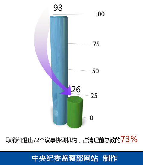 在调整内设机构的同时,黑龙江省纪委从纪检监察机关自身职能出发,在98个议事协调机构中,最终确定保留和继续参与26个,占清理前总数的27%,取消和退出72个,占清理前总数的73%。