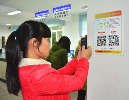 图:1月2日,一名办事群众在城厢区行政服务中心大厅扫描“服务窗口微信监督举报平台”二维码