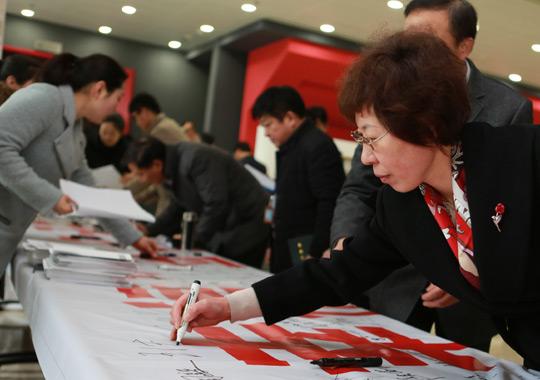 图为领导干部和配偶正在“远离贪腐,守护幸福”活动主题横幅上签名