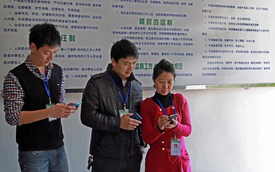 福建光泽县纪委、监察局党员干部正在接收查看廉政短信