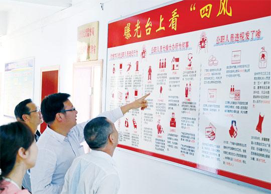 “你想不到的公职人员违纪行为”“公职人员大操大办所为何事”“公职人员违规发了啥”……福建省光泽县纪委在开展党的群众路线教育实践活动过程中,针对“四风”方面问题选取35个违反中央八项规定精神的典型案例,制作了“曝光台上看‘四风’”廉政警示教育展板,悬挂于各乡镇及社区办公室走廊,以别开生面的形式开展廉政警示教育。(吴剑雄 王建隆 宋志峰 摄影报道)