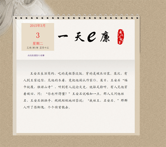为进一步推动党风廉政建设和反腐败工作深入开展,山东省纪委监察厅网站推出了《一天e廉》栏目,每天发布一则廉政小故事,借助这些既具有阅读趣味、又具有警示意义的小故事或经典语句,发挥熏陶和引导作用,持续传递廉洁正能量。