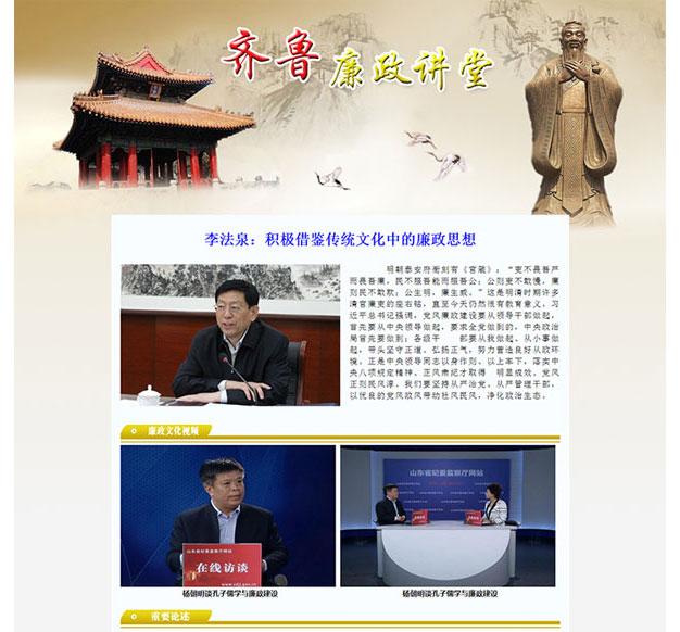 以儒家思想为主干的齐鲁文化是中国传统文化的杰出代表,蕴含着丰富的廉政思想。为更好地学习、运用传统文化中的廉政思想,山东省纪委监察厅网站推出《齐鲁廉政讲堂》专题,通过专家访谈、廉政作品展播、文献摘登等形式,展现传统文化中的精髓,汲取营养精华,推动党风廉政建设和反腐败工作深入开展。