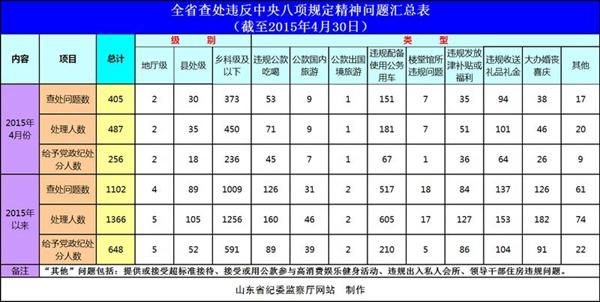 2015年4月,山东省纪检监察机关查处违反中央八项规定精神问题405起,处理487人,给予党纪政纪处分256人。