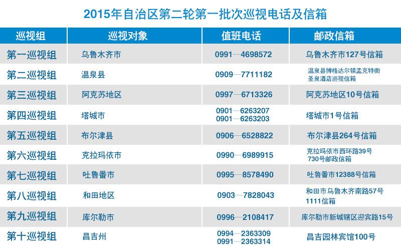 根据新疆维吾尔自治区党委统一部署,近日,自治区第一至第十巡视组,完成了2015年自治区第二轮第一批次巡视6个地州市和4个县市的进驻。巡视期间,各巡视组均设专门值班电话(受理时间为北京时间10:00--22:00)和专门邮政信箱,主要受理反映被巡视单位领导班子、下一级领导班子主要负责人和重要岗位领导干部问题的来信来访。