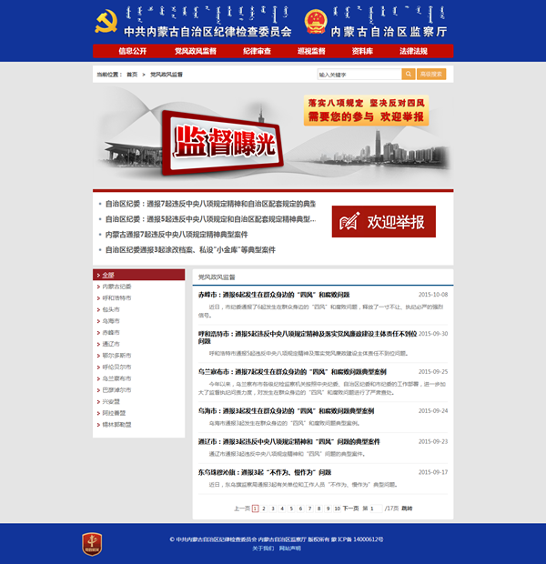 为严明党的政治纪律和组织纪律,监督“两个责任”的落实,驰而不息纠正“四风”,严肃查处发生在群众身边的腐败问题,内蒙古自治区纪委监察厅在内蒙古纪检监察网站建立了“党风政风监督”举报平台。