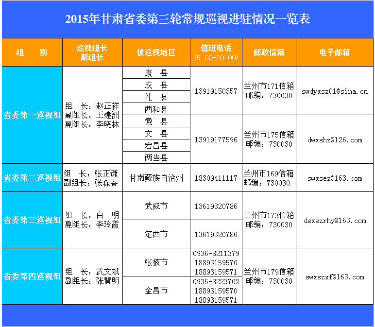 本轮巡视组受理信访的时间为2015年11月上旬至2016年1月30日,目前,已全部公布了值班电话、邮政信箱和电子信箱。(甘肃省纪委)