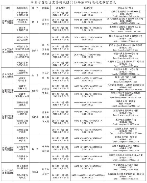 经内蒙古自治区党委批准,2015年自治区党委第四轮巡视共派出7个巡视组,对呼和浩特市土默特左旗、托克托县等20个旗县(市区)开展常规巡视。截至12月9日,自治区党委巡视组已全部进驻20个旗县(市区)并展开巡视工作。本轮巡视是自治区党委《<巡视工作条例>实施办法》实施后,开展的新一轮巡视。