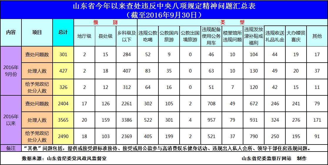 2016年前三季度,山东省各级纪检监察机关查处违反中央八项规定精神问题2404起,处理3565人,党纪政纪处分2490人。