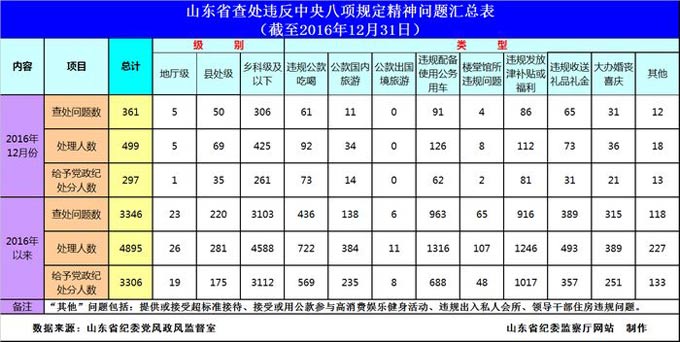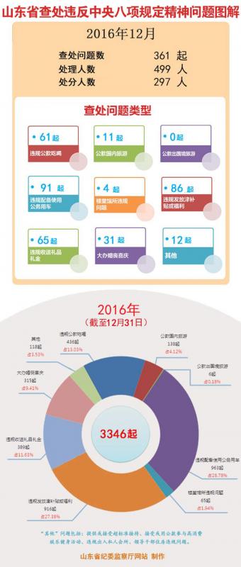 2016年12月,山东省各级纪检监察机关查处违反中央八项规定精神问题361起,处理499人,处分297人。2016年全年山东省各级纪检监察机关共查处违反中央八项规定精神问题3346起,处理4895人,处分3306人。