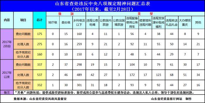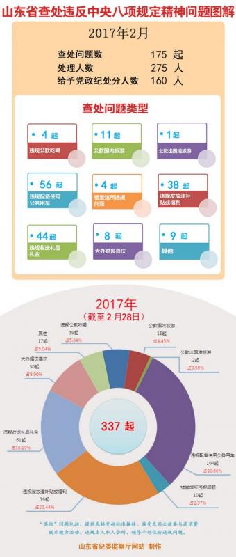 2017年2月,山东省各级纪检监察机关查处违反中央八项规定精神问题175起,处理275人,处分160人。
