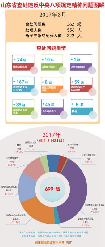 2017年第一季度,山东省各级纪检监察机关查处违反中央八项规定精神问题699起,处理1093人,处分654人。从查处问题类型看,违规配备使用公务用车、违规发放津补贴或福利、大办婚丧喜庆以及违规公款吃喝4类问题较为突出,占查处总量的84%。