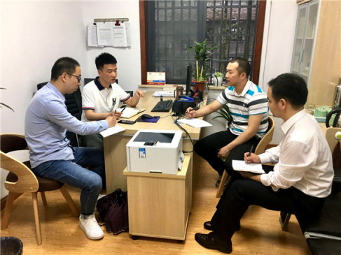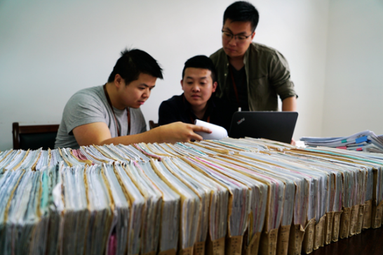 温岭市纪委市监委青年纪检监察干部陈瑞阳、李海超等正在核对检查留置案件相关笔录材料。
