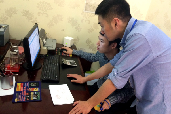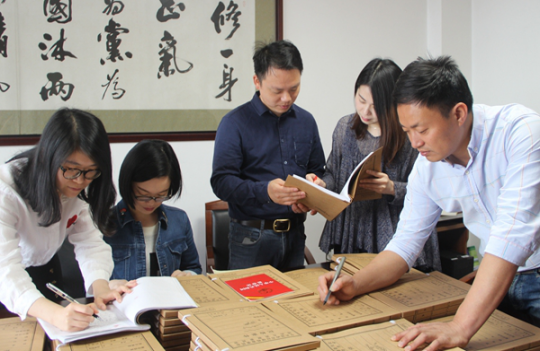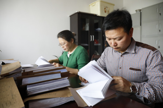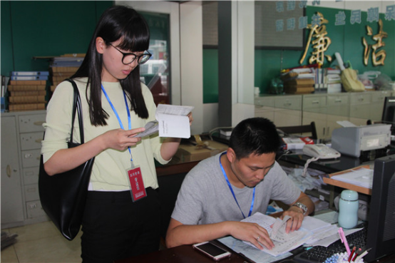 儒岙镇纪委委员丁钇伟与乡镇干部竺晟逸、孙星火就信访件反映的问题,在镇农经站查阅相关账簿资料,一一核对有关问题。