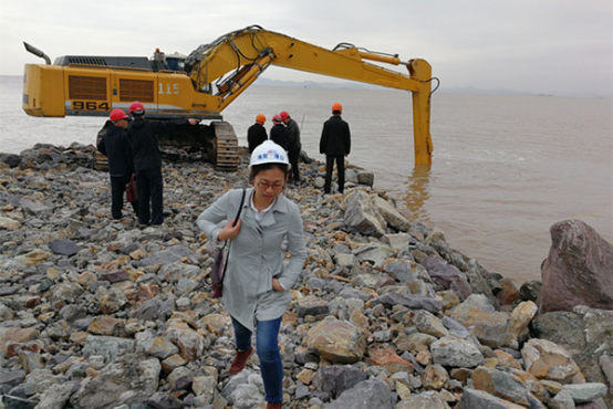 岱山县纪委派驻县财政局青年纪检监察干部刘瑛对财政部门下属单位舟山海宏港口投资开发有限公司实施的长涂双剑涂围垦项目开展现场督查。