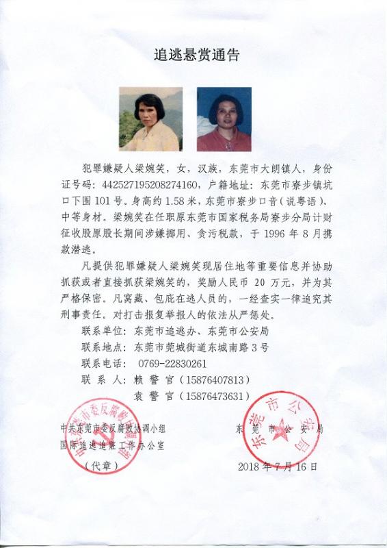 据了解,该在逃人员名为梁婉笑,女,1952年8月出生,东莞市大朗镇人,其在担任东莞市国家税务局寮步分局计财征收股股长期间涉嫌挪用、贪污税款,1996年8月携款潜逃隐匿,下落不明。为认真落实中央、省追逃追赃工作部署,东莞市出台了《2018年东莞市追逃追赃和防逃专项工作实施方案》。根据有关工作部署,东莞市监委决定对梁婉笑采取通缉措施,并由公安机关发布通缉令和悬赏追逃通告。