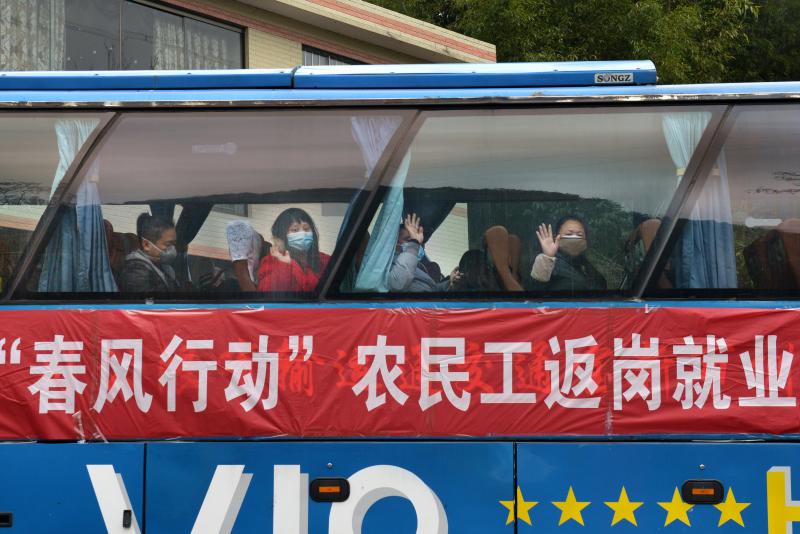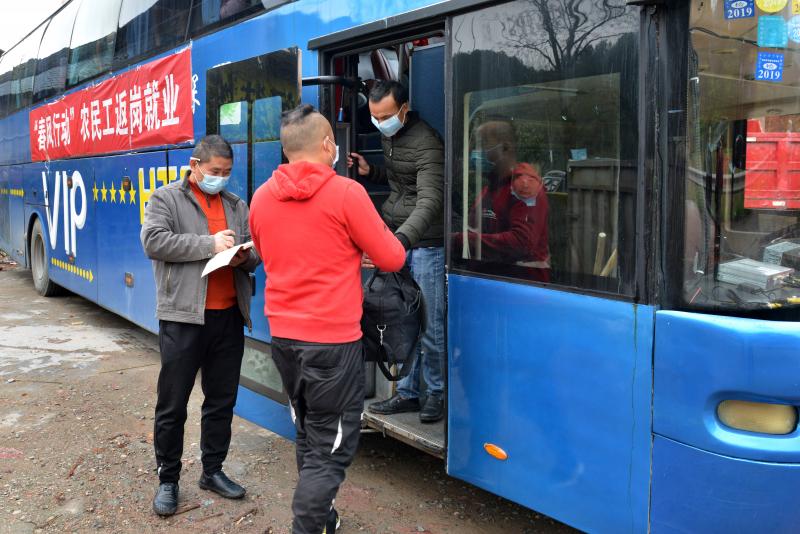 3月1日上午, 湖南省洪江市黔城镇干溪坪村26名回家过年的村民乘坐“春风行动”专车前往深圳返岗务工。自2月12日“春风行动” 启动以来,该市就业局积极与交通、卫健等部门协作,在做好疫情防控的同时,保障农民工安全有序返岗就业,采取开通“点对点、一站式” 返岗专车运输模式,做好务工人员上车前身体检测和办理健康证明,确保农民工及时、安全有序返岗。(杨锡建 何建明)