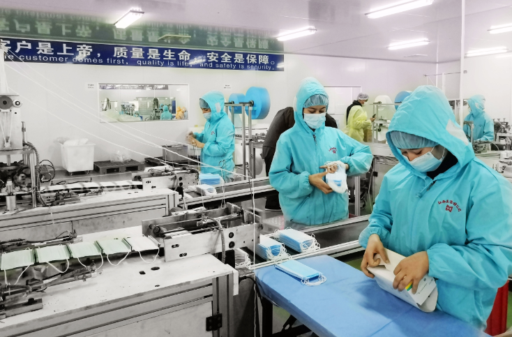3月6日,江西省九江市德安县美宝利医用敷料有限公司,员工在生产包装防护口罩。江西美宝利是省内为数不多的口罩生产企业,在当地政府的引导支持下,该公司及时新增4条全自动生产线,日产量由年初的10万只增加到100万只,占江西口罩总产量的10%以上。李诗彪 王佳 摄