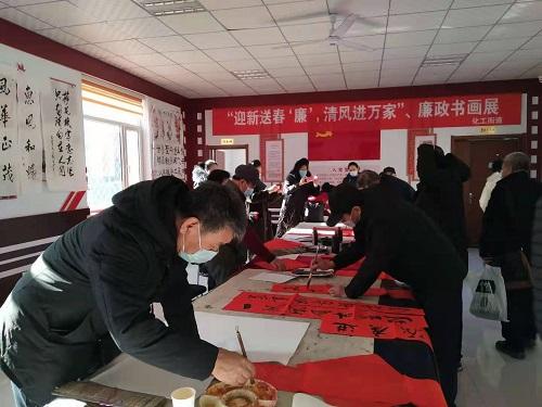 【清廉网】(朱莉莉)“翰墨书正气、廉歌颂清风”,2月4日上午九时,辽宁省葫芦岛市连山区化工街道盛化社区内翰墨飘香。80余位书画爱好者济济一堂,与当地群众一起,以基层党风廉政建设为题,泼墨挥毫,现场书写廉诗警句,摹绘清风画卷。