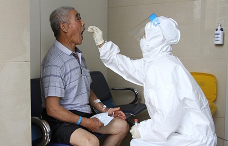 宣城中心医院发热门诊旁的核酸采样点,工作人员为朱美德老人快速进行咽拭子取样。