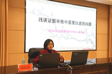 自治区纪委监委案件审理室副主任陈红梅作《浅谈证据审核中需要注意的问题》专题辅导