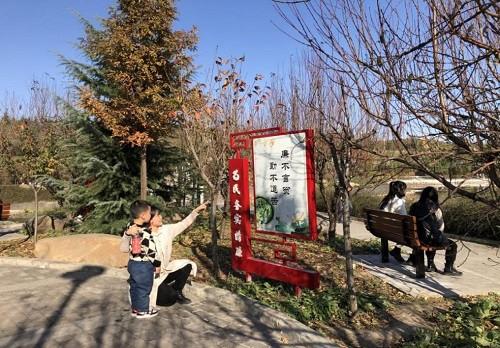 图为兴平市廉政文化主题公园内,一位母亲在向孩子讲解“廉不言贫,勤不道苦”的故事。秦博 摄。