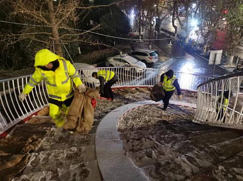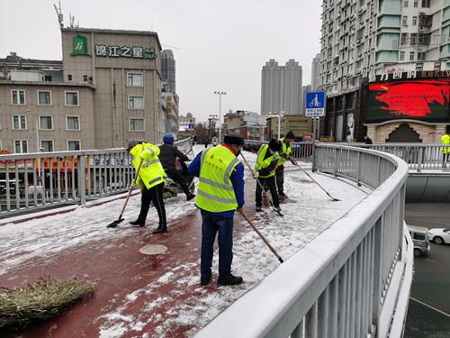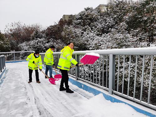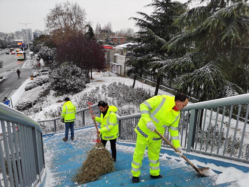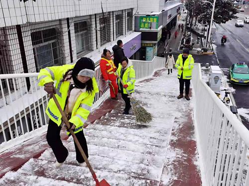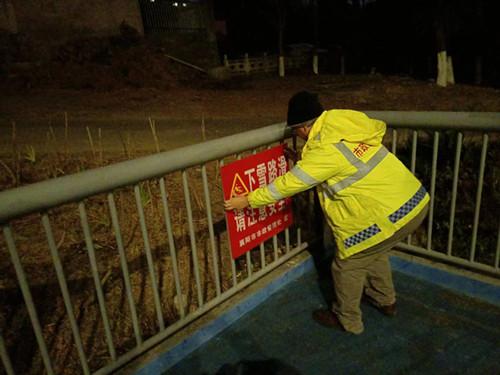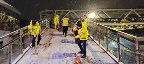 市住建局市政管理处200余名党员干部职工星夜出发,分头奔赴市区10余座人行天桥开展工作。悬挂安全提示牌、清扫桥面积雪、铺设防滑垫、撒放融雪剂等一气呵成,多措并举提醒保障路人出行安全。