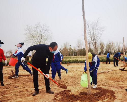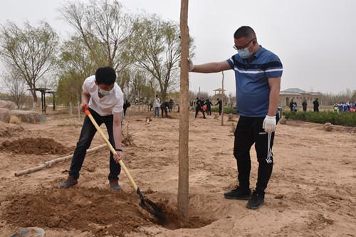 在沙漠植物园植树点,纪检干部两三人一组,一人挖坑,一人扶树苗,一人铲土填埋,配合十分默契。通过大家共同努力,一棵棵旱柳、垂榆、香花槐等“清风树”笔直挺立、整齐排列,展现出勃勃生机,为大自然再添一抹新绿,孕育了一份希望。
