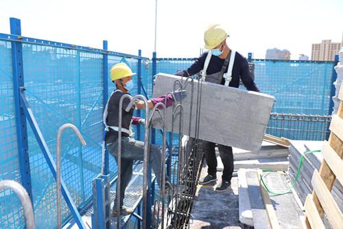 “目前,金澜华府项目1号楼已施工至18层,即将封顶。1号楼封顶后,将进入砌体及二次结构施工,待爬架拆除后,1号楼会优先进入外墙保温装饰面层施工,同比其他楼才进入保温层施工,这项工艺的应用使得施工工序精简化。”技术人员说。