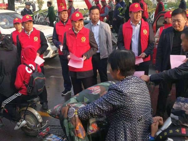 县委书记卢建和志愿者们一起向过往行人发放交通志愿倡议书