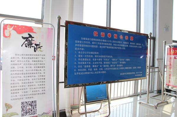 图为在县行政审批局等窗口单位设立了投诉举报公示牌和“儒乡廉韵”微信举报平台二维码,接受群众投诉举报。