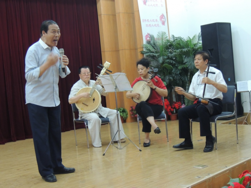 通过社区的精心策划、组织,上午9时,演出活动在社区烽火合唱团的《祖国不会忘记》歌声中拉开了帷幕,14个节目演出圆满成功。由10岁小朋友小提琴独奏节奏欢快的《步列舞曲》;京韵大鼓抗战歌曲的《重整河山待后山》耳熟能详;社区小乐队的几位老兵乐器合奏的《十送红军》,表达了对革命先烈的怀念之情;京剧《女起解》演唱得淋漓尽致;京歌演唱《中国脊梁》唱出了中国人的信心和力量;乐逍遥先生的笛子独奏《赶牲灵》笛声悠扬美妙,令人沉醉不已;非物质文化古琴项目代表传承人孔德辉先生的古琴《流水》,充挥发挥了古琴的器乐化特点,展示了古琴所特有的艺术感染力,将演出推向了高潮……