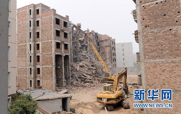 7月17日,一家拆除公司利用大型机械设备对“汇景嘉园”小区一栋问题拆迁安置房进行拆除。当日,因为存在严重的质量问题和安全隐患,郑州市“汇景嘉园”小区一处拆迁安置小区8栋刚封顶2个月的多层楼房,开始全部拆除、重新建设。近300户回迁户的回迁计划最早也要延期到明年5月份。 新华社记者 赵鹏 摄