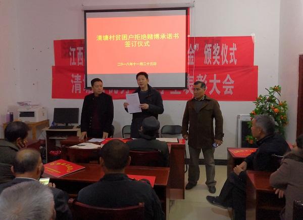 清廉网讯(李小斌 许利)为筑牢党员干部廉洁自律思想防线,促贫困户自力更生、勤俭持家,莲花县良坊镇组织村第一书记、村两委与村党员、贫困户签订《拒绝赌博承诺书》,营造脱贫攻坚风清气正良好氛围。图为日前清塘村签订仪式现场。(江西省萍乡市莲花县纪委监委)
