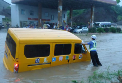 湖南临湘最美女交警暴雨中徒手撑起侧翻校车