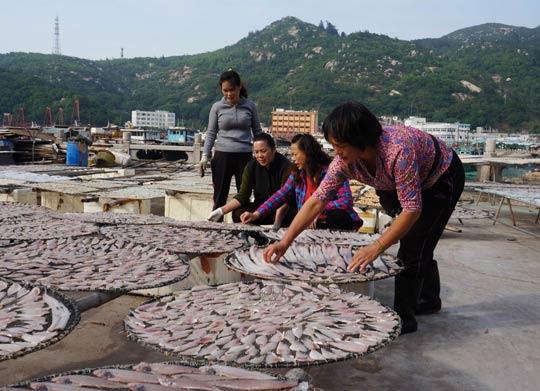 殷金好(右二)在与生晒海味的渔民交流生产情况。图片来源:新华社 魏蒙 摄
