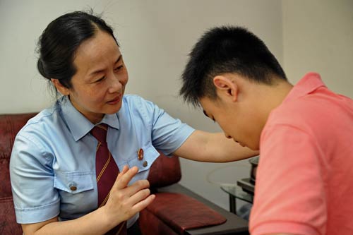 詹红荔(左)与一位失足少年谈心,鼓励他走出阴影。张国俊 摄