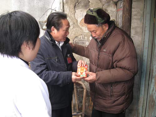 张祥元(中)走访村里的困难户。 杨建秋 摄
