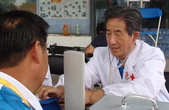 叶如陵在为奥运志愿者义诊(2008年8月21日摄)